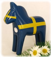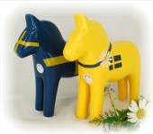 Dalahäst design Carin Kry. Gul med prästkrage och svensk flagga. Trevlig som bordsdekoration och present!
