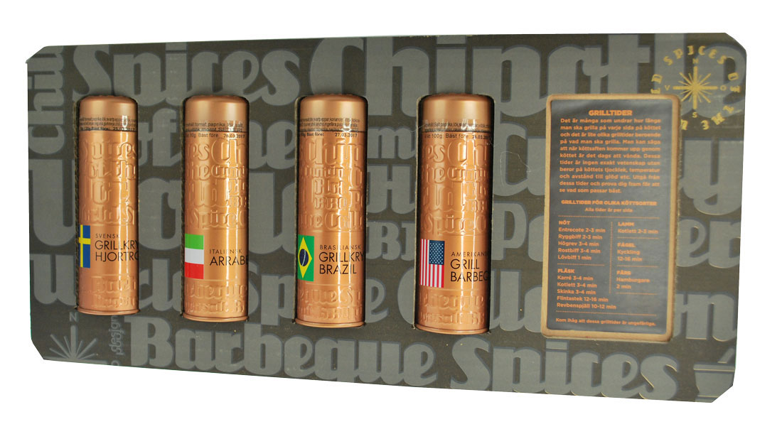 En urban present med fyra designade plåtburkar fyllda med kryddor från delar av världen.