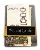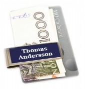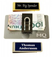 Sedelklämma i guldmetall. Välj plåt i svart, blå eller röd. Smidig i fickan. Välj med logo, bild och gravyrtext. Storlek 55x20mm.